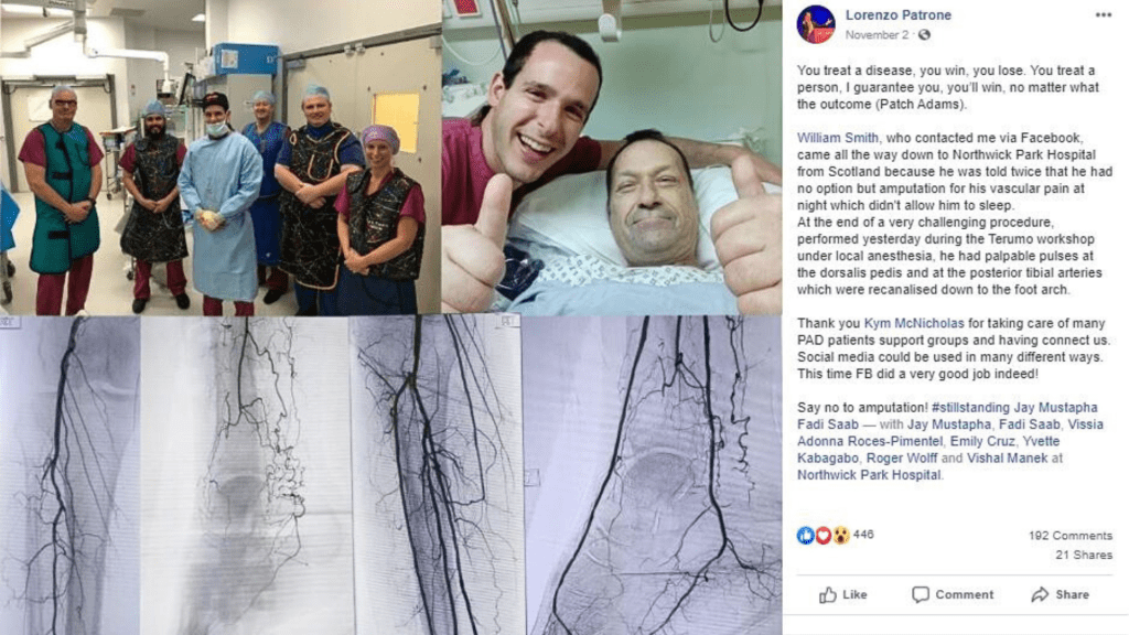 Dr. Patrone advised Smith of other interventional options that could save his leg. Smith’s vascular specialists, not trained in advanced endovascular limb salvage, still told him no option but amputation.